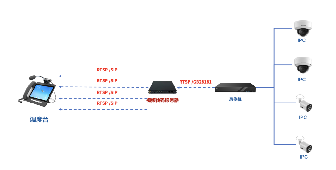 通过部署思载科技等视频转码服务器可以有效的解决这一问题,不改变现有指挥调度系统任何结构和配置。视频转码服务器可以通过RTSP,GB/T28181方式对接军营中的视频监控系统。调度台调看视频时全部从视频转码服务器调取,可以继续使用RTSP方式,也可以使用SIP,WebRTC,FLV等方式调取。